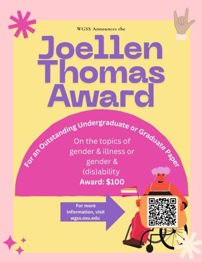 The Joellen Thomas Award is named posthumously for a 1998 graduate of the Women's, Gender and Sexuality Studies (then Women's Studies) MA program. It is presented annually for the outstanding undergraduate or graduate paper about gender and illness or gender and (dis)ability written for a Women's, Gender and Sexuality Studies class or an approved elective.